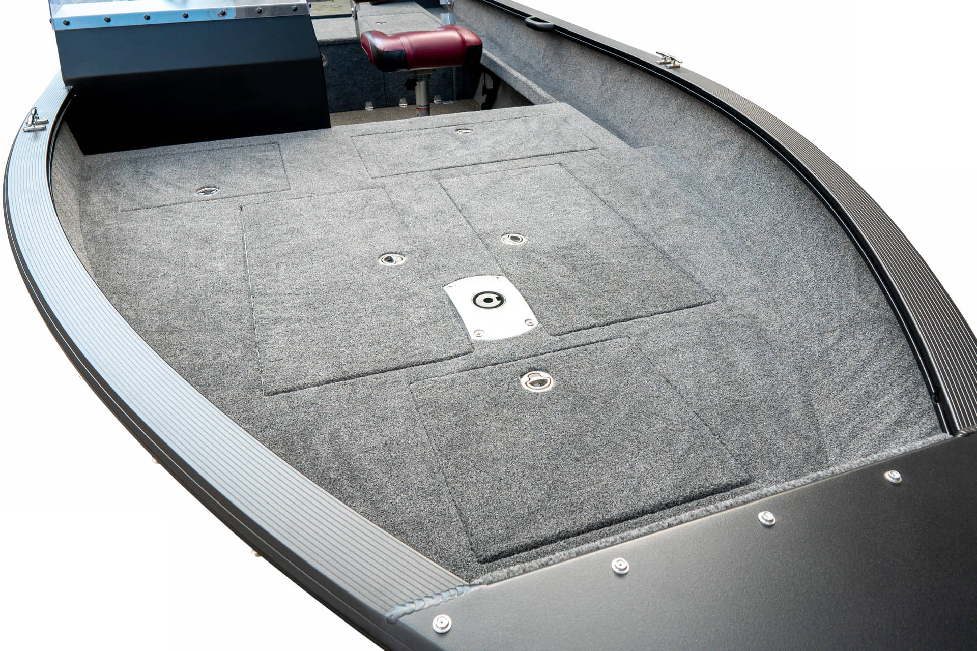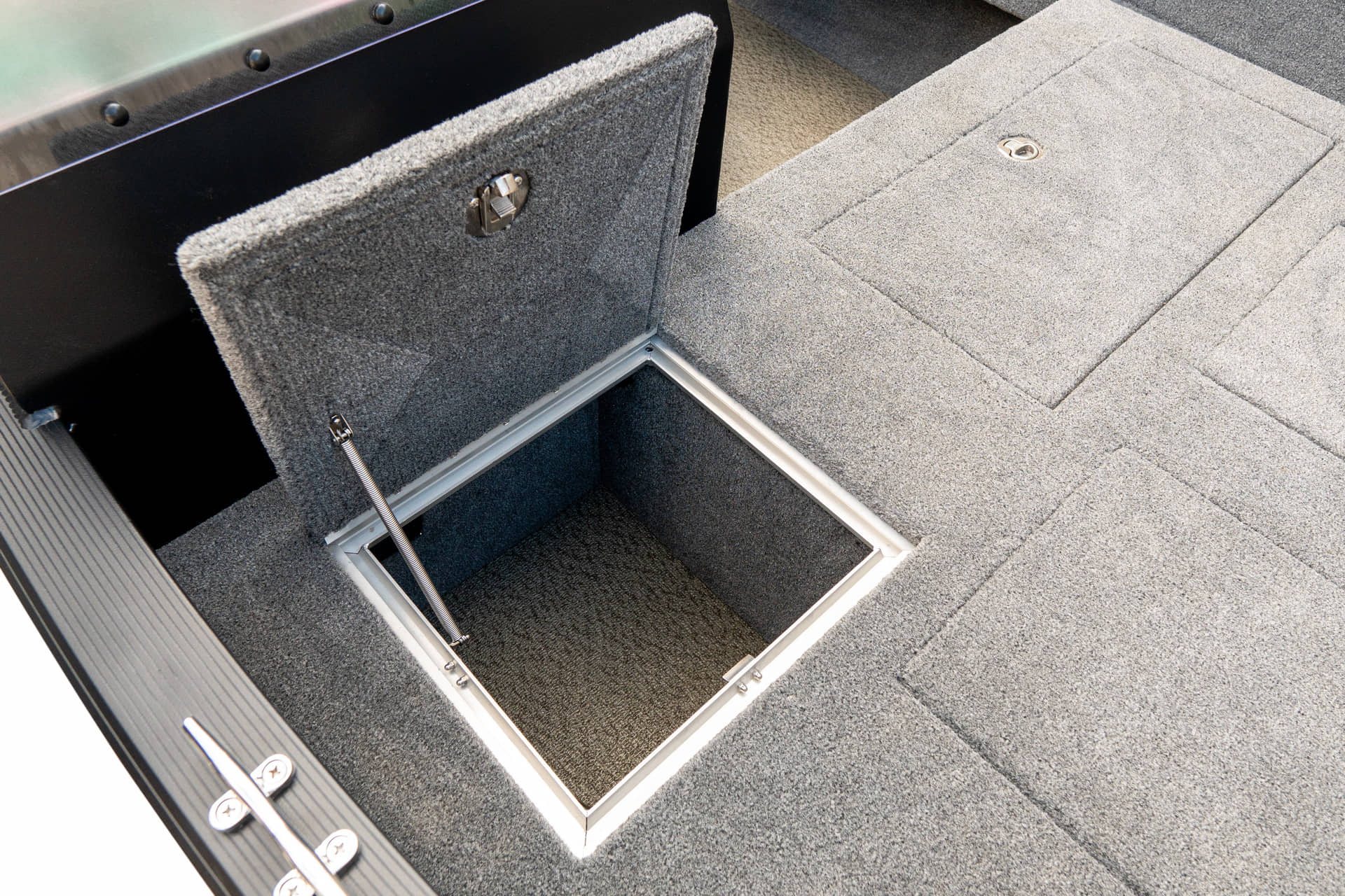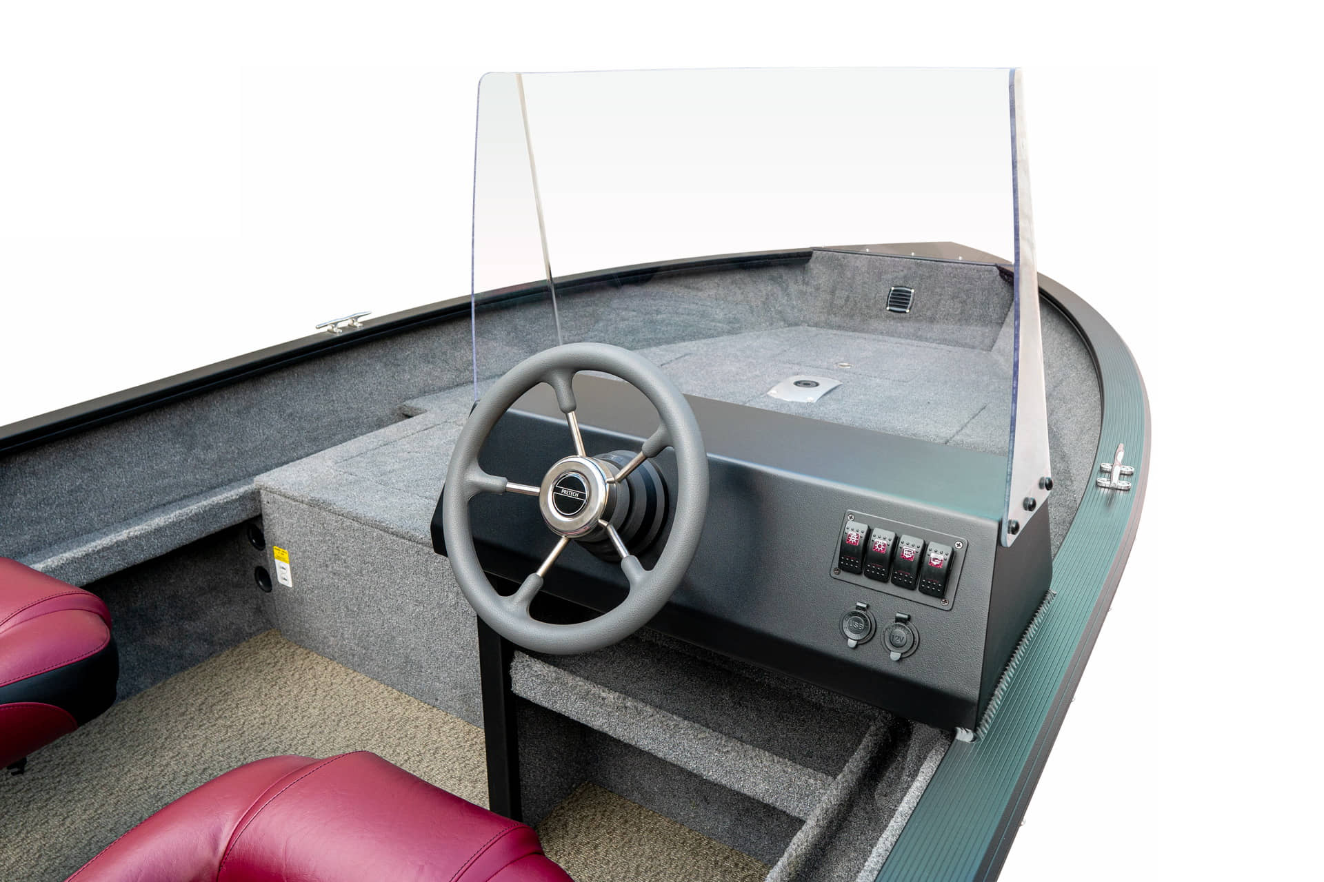 Angelplattform mit 80-Liter-Aquarium mit Sauerstoffzufuhr und vier Staufächern Navigationslichter (grün, rot) Bilgenpumpe HAUPTSCHALTER Auskleidung des Stauraums Zwei USB-Anschlüsse – Typ C Bedienfeld mit 4 Tasten Außenteppich für Boote (hinteres Angeldeck und Seitenwände) Bodenbelag aus Vinyl (Angeldeck, Stauraum, Cockpit) Edelstahl-Schrankschloss-Set Vier Ankerratschen aus Edelstahl Sicherungskasten für 6 Geräte Zwei Ablagefächer zur Aufbewahrung von Spulen auf der rechten und linken Seite An Steuerbord befindet sich eine Vorrichtung zur Aufbewahrung und zum Transport von zwei Angelruten. Vorbereitung zum Einbau der Batterie Kapitänssitz auf einem Podest Kabelmanagement Aluminiumkonsole mit Windschutzscheibe