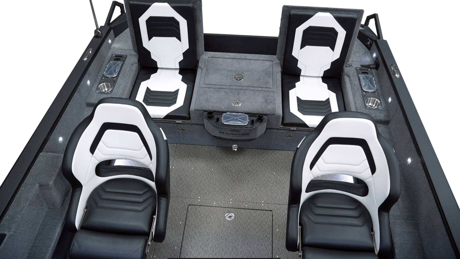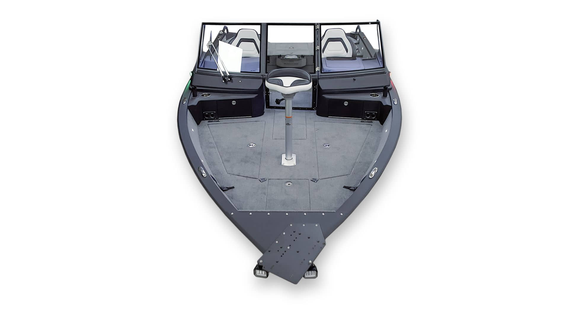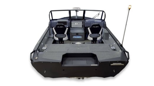 Vollverschweißte Karosserie Zwei Konsolen aus gehärtetem Glas Außenteppich für das Boot (Angeldeck, Achter-Angeldeck und Seitenwände) Vinyl (Cockpit) Trockene Boxen für Ausrüstung und Köder mit Belüftungs- und Ablaufsystem Batteriekasten hinten Markisen-Staufach In den Konsolen befinden sich Boxen zur Aufbewahrung von Angelausrüstung und persönlichen Gegenständen. Seitliche Schubladen im Cockpit 90-Liter-Aquarium im Heck mit Sauerstoffanreicherung, Beleuchtung und Umwälzzeitschaltuhr 150-Liter-Kraftstofftank für Außenbordmotor mit Kraftstofffilter Bedienfeld mit 12 Tasten Zwei USB-Anschlüsse – Typ C – an der Fahrer- und Beifahrerkonsole Navigationslichter (grün, rot) Eingebaute Schwenkhalterungen in Fahrer- und Beifahrerkonsole Edelstahl-Fahrgastgriff LED-Beleuchtung in einem Glasrahmen Haltegriffe unter dem Glas mit gefrästen Aluminiumgriffen Dekorative, gefräste Aluminiumleisten an der Seitenscheibe Vorbereitung für die Installation von Echoloten, Elektromotor, hydraulischer Druckerhöhungspumpe, autonomer Heizung, beheizten Sitzen und Hochdruckreiniger Automatische Entwässerungspumpe HAUPTSCHALTER Angelstuhlgestelle Fahrer- und Beifahrersitze auf Stoßdämpfern Hintere Sitzreihe mit „Transformer“-Sitzen auf dem Achterdeck mit individuellen Ablagefächern für die Passagiere Sechs einziehbare Ratschen aus Edelstahl Edelstahl-Schrankschloss-Set Teleskopleiter auf der rechten Seite Zwei Staufächer auf dem Cockpitdeck für Antriebs- (Service-)Batterien und persönliche Gegenstände. Drehplätze mit Befestigungsgurten (4 Stück - Vordeck, 2 Stück - auf der linken Seite im Cockpit) Die Sicherheitsgriffe an der Rückseite sind aus gefrästem Aluminium gefertigt. Staufach in der Mitte des Vordecks für 10 Spinnruten Deckblatt